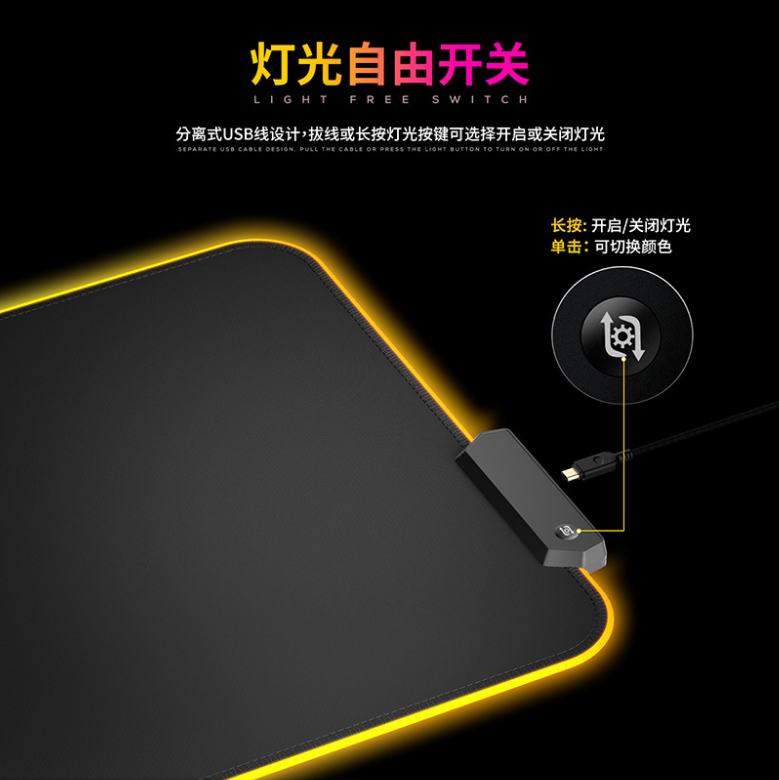炫彩RGB游戲鼠標(biāo)墊,織物面料編織,表面細(xì)膩、平整、操作穩(wěn)定,帶燈光切換按鍵,輕輕一按,燈光可自由切換,加厚橡膠底部,穩(wěn)固防滑